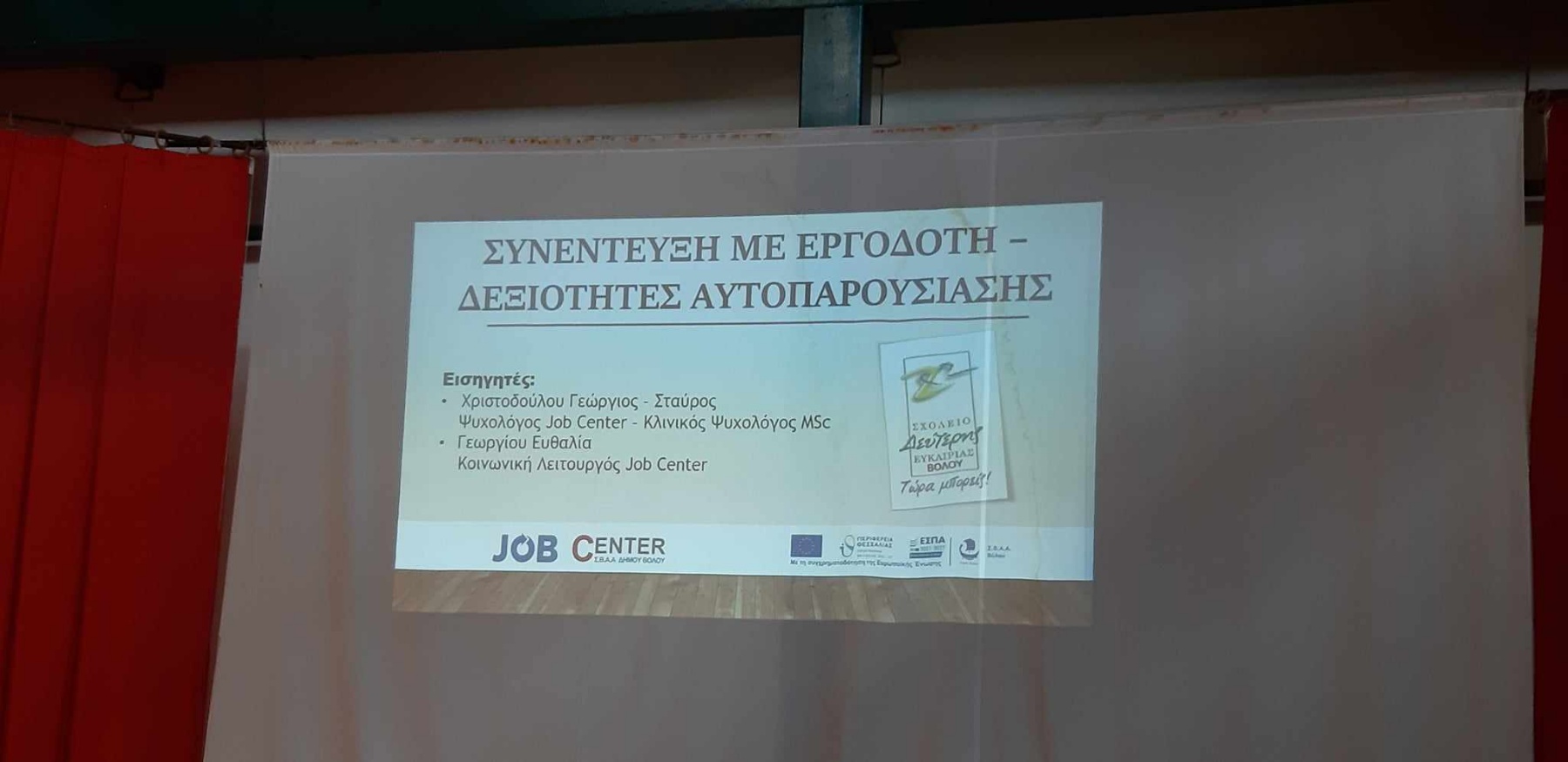 Την Πέμπτη 23-05-2024 το Γραφείο Διευκόλυνσης, Ενδυνάμωσης και Τεκμηρίωσης της Απασχόλησης Job Center του Δήμου Βόλου πραγματοποίησε βιωματική παρουσίαση στο Σχολείο Δεύτερης Ευκαιρίας Βόλου με θέμα «Συνέντευξη με Εργοδότη - Δεξιότητες Αυτοπαρουσίασης».