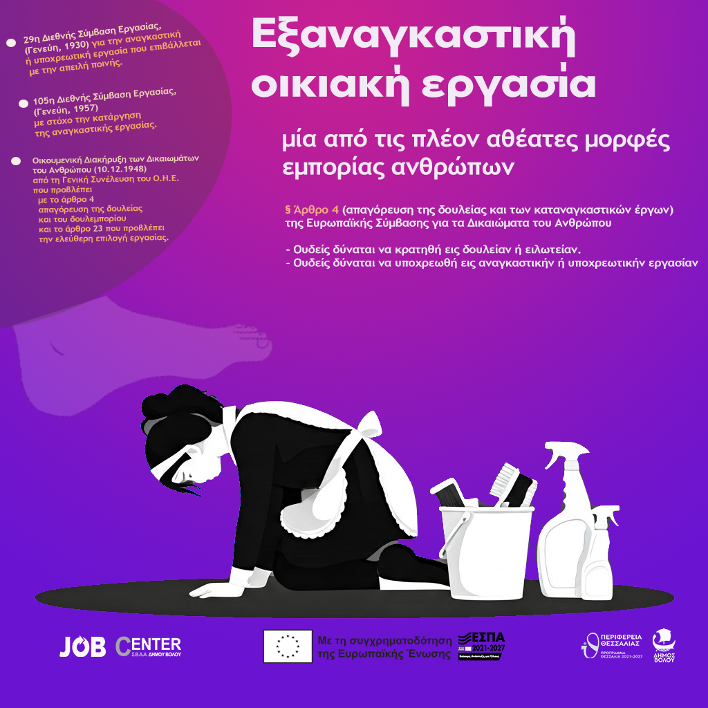 Με αφορμή την παραπάνω διαπίστωση, τo Γραφείο Διευκόλυνσης, Ενδυνάμωσης και Τεκμηρίωσης της Απασχόλησης "Job Center" Δήμου Βόλου, ανταποκρίθηκε έγκαιρα στη συμμετοχή του στην εκπαίδευση που έλαβε χώρα στις 26.11 με στόχο την ενημέρωση και ευαισθητοποίηση των επαγγελματιών πρώτης γραμμής, αναφορικά με τις ιδιαιτερότητες της εξαναγκαστικής οικιακής εργασίας, τους κινδύνους που διατρέχουν τα θύματα και τις στρατηγικές για την καταπολέμηση του φαινομένου.