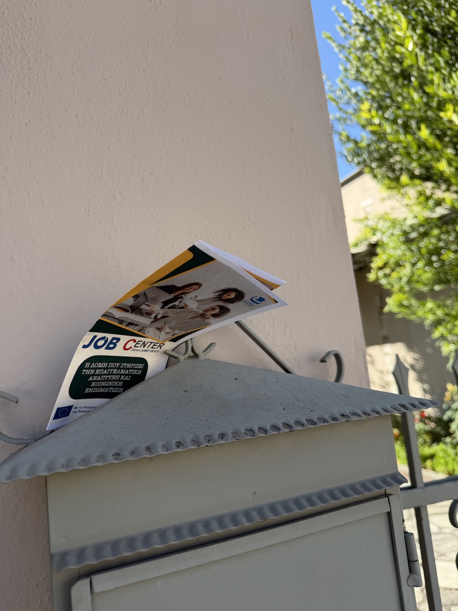 Η ομάδα του Job Center επισκέφθηκε, ενημέρωσε και μοίρασε υλικό σε επιχειρήσεις , σημεία συνάντησης της τοπικής κοινότητας αλλά πήγε και πόρτα- πόρτα σε σπίτια της περιοχής, παρουσιάζοντας τις υπηρεσίες υποστήριξης εύρεσης εργασίας, καθώς και τις δυνατότητες συνεργασίας με εργοδότες για κάλυψη κενών θέσεων.
