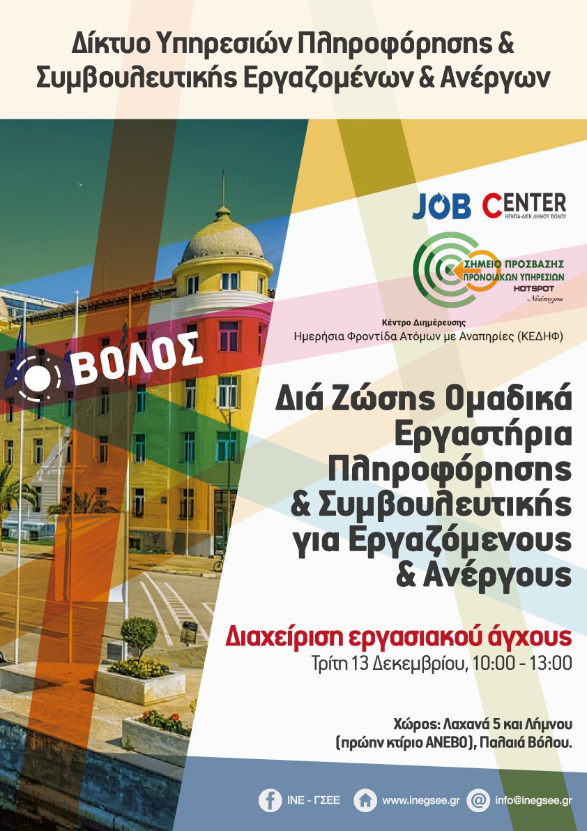 ΔΕΛΤΙΟ ΤΥΠΟΥ Την Τρίτη 13/12/2022 και έχοντας στόχο τις δυνατότερες ποιοτικές υπηρεσίες μέσα από συνέργειες και δικτυώσεις με ομότιμες Δομές υλοποιήθηκε εκ νέου εργαστήριο με τη συνδρομή του Δικτύου Πληροφόρησης και Συμβουλευτικής Εργαζομένων και Ανέργων του ΙΝΕ-ΓΣΕΕ Θεσσαλίας. Η θεματολογία αφορούσε τη "διαχείριση του εργασιακού άγχους" και προέκυψε έπειτα από εισήγηση του Γραφείου Διευκόλυνσης, Ενδυνάμωσης και Τεκμηρίωσης της Απασχόλησης Job Center της ΚΕΚΠΑ-ΔΙΕΚ Δήμου Βόλου που αφουγκραζόμενο το εργασιακό στρες ως ένα φαινόμενο της εποχής μας θέλησε να συμμετέχει ενεργά μέσα από ένα εργαστήρι που διεξήχθη από τους εξαιρετικούς συναδέλφους του ΙΝΕ-ΓΣΕΕ Θεσσαλίας νοηματοδοτώντας σε αυτό όχι μόνο θεωρητικά αλλά κυρίως εμπειρικά στοιχεία.