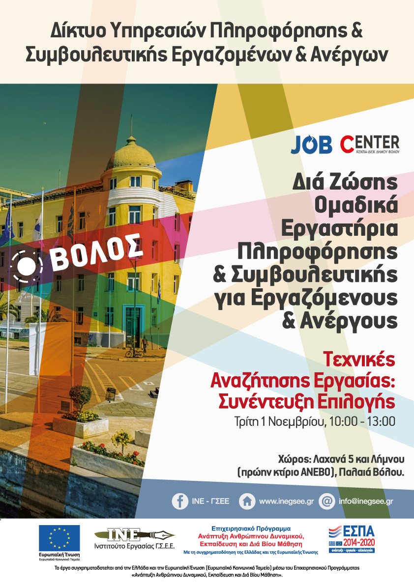 ΒΟΛΟΣ Την Τρίτη 1/11/2022, και ώρα 10:00-13:00, θα πραγματοποιηθεί από το ΙΝΕ-ΓΣΕΕ δια ζώσης θεματικό εργαστήριο συμβουλευτικής με τίτλο "ΤΕΧΝΙΚΕΣ ΑΝΑΖΗΤΗΣΗΣ ΕΡΓΑΣΙΑΣ: ΣΥΝΕΝΤΕΥΞΗ ΕΠΙΛΟΓΗΣ"! Το εργαστήριο υλοποιείται από τη δομή του Δικτύου Πληροφόρησης και Συμβουλευτικής Εργαζομένων και Ανέργων του ΙΝΕ ΓΣΕΕ Θεσσαλίας σε συνεργασία με το Γραφείο Διευκόλυνσης, Ενδυνάμωσης και Τεκμηρίωσης της Απασχόλησης “Job Center” της ΚΕΚΠΑ ΔΙΕΚ του Δήμου Βόλου στις εγκαταστάσεις της δομής στα Παλαιά Βόλου (Λαχανά 5 με Λήμνου)!