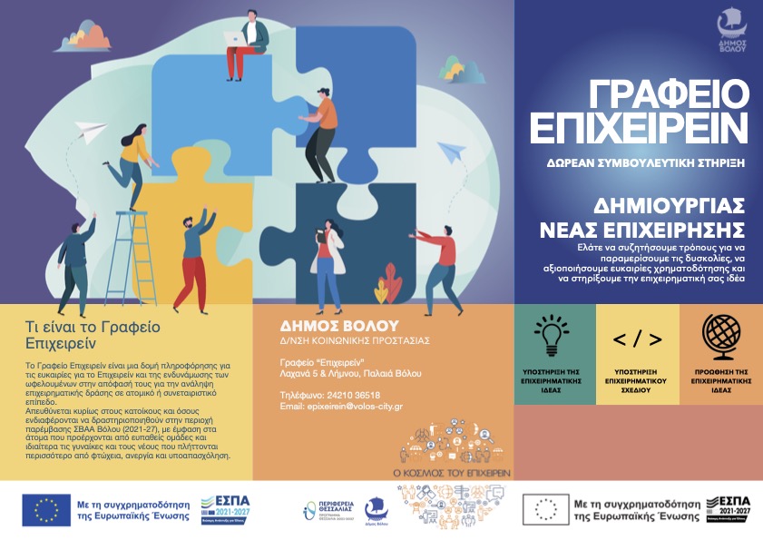 | Το Γραφείο Επιχειρείν είναι μια δομή πληροφόρησης για τις ευκαιρίες για το Επιχειρείν και της ενδυνάμωσης των ωφελουμένων στην απόφασή τους για την ανάληψη επιχειρηματικής δράσης σε ατομικό ή συνεταιριστικό επίπεδο. Απευθύνεται κυρίως στους κατοίκους και όσους ενδιαφέρονται να δραστηριοποιηθούν στην περιοχή παρέμβασης ΣΒΑΑ Βόλου (2021-27), με έμφαση στα άτομα που προέρχονται από ευπαθείς ομάδες και ιδιαίτερα τις γυναίκες και τους νέους που πλήττονται περισσότερο από το μέσο όρο από φτώχεια, ανεργία και υποαπασχόληση. Η δομή λειτουργεί σε συνέργεια με το Job Center και άλλες κοινωνικές δομές (όπως το Κέντρο Κοινότητας) και θα απασχολήσει συνολικά 4 άτομα διαφόρων ειδικοτήτων. |