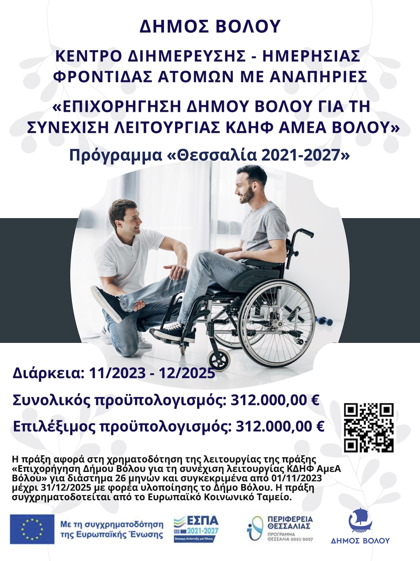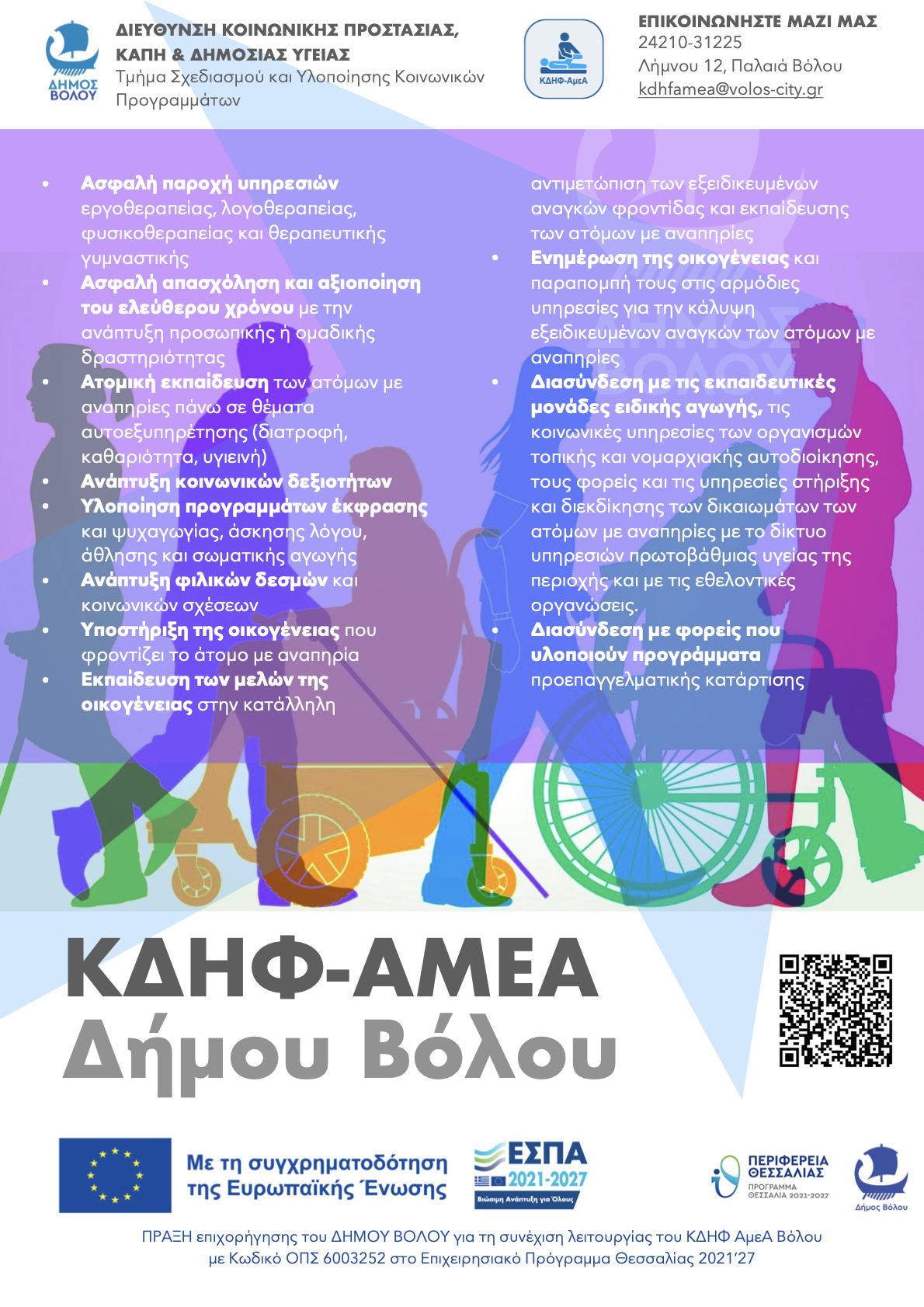 Ο Δήμος Βόλου, καλεί άτομα με πιστοποιημένη αναπηρία τα οποία ενδιαφέρονται να συμμετάσχουν στο πρόγραμμα του Κέντρου Διημέρευσης και Ημερήσιας Φροντίδας Ατόμων με Αναπηρία (ΚΔΗΦ-ΑΜΕΑ) να υποβάλλουν την αίτησή τους για δωρεάν παροχή ημερήσιας φροντίδαςΗ Πράξη εντάχθηκε στο ΕΣΠΑ 2021-'27 |
