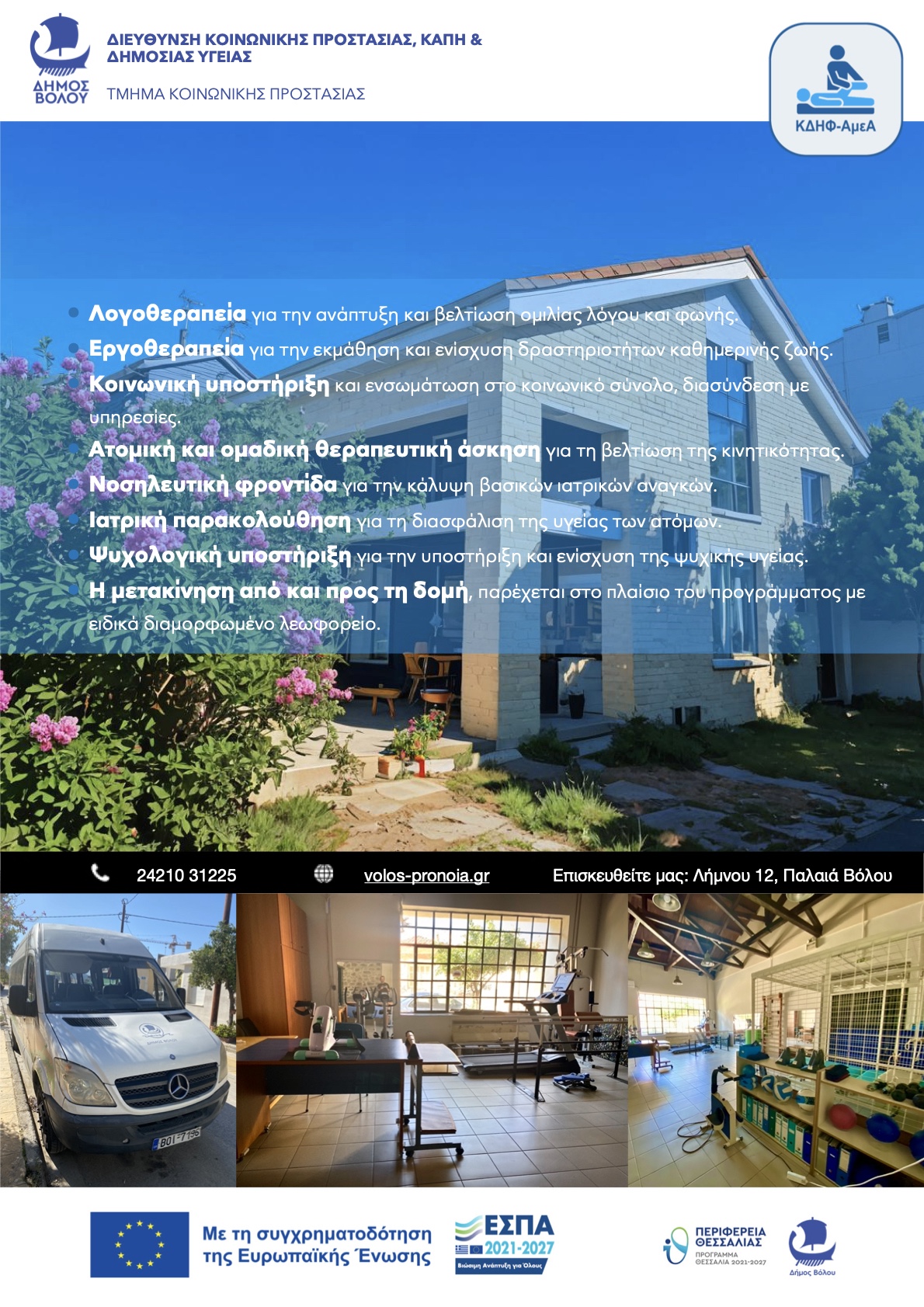 - Το ΚΕΝΤΡΟ ΔΙΗΜΕΡΕΥΣΗΣ - ΗΜΕΡΗΣΙΑΣ ΦΡΟΝΤΙΔΑΣ ΑμεΑ βρίσκεται στην οδό Λήμνου 12 & Ελασσόνας, Παλαιά Βόλος Τηλ./ Fax. 24210 31860
