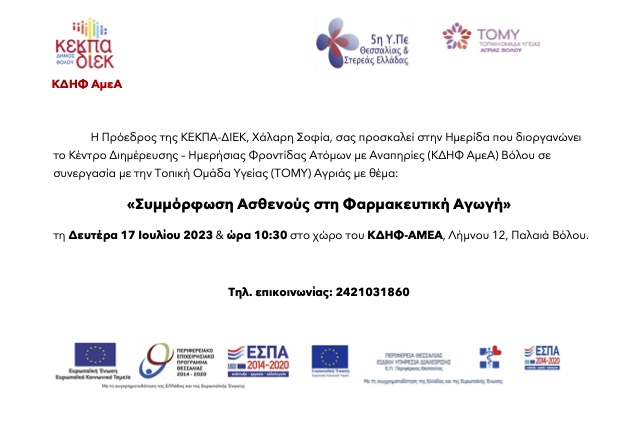 ΔΕΛΤΙΟ ΤΥΠΟΥ Το Κέντρο Διημέρευσης-Ημερήσιας Φροντίδας Ατόμων με Αναπηρία της ΚΕΚΠΑ-ΔΙΕΚ του Δήμου Βόλου σε συνεργασία με την Τοπική Μονάδα Υγείας Αγριάς, διοργανώνει Ημερίδα με θέμα “Συμμόρφωση του ασθενούς στη φαρμακευτική αγωγή”. Η εκδήλωση θα πραγματοποιηθεί τη Δευτέρα 17 Ιουλίου 2023 και ώρα 10:30 πμ στο χώρο του ΚΔΗΦ ΑμεΑ (Λήμνου 12-Ελασσόνος, Παλαιά Βόλου).