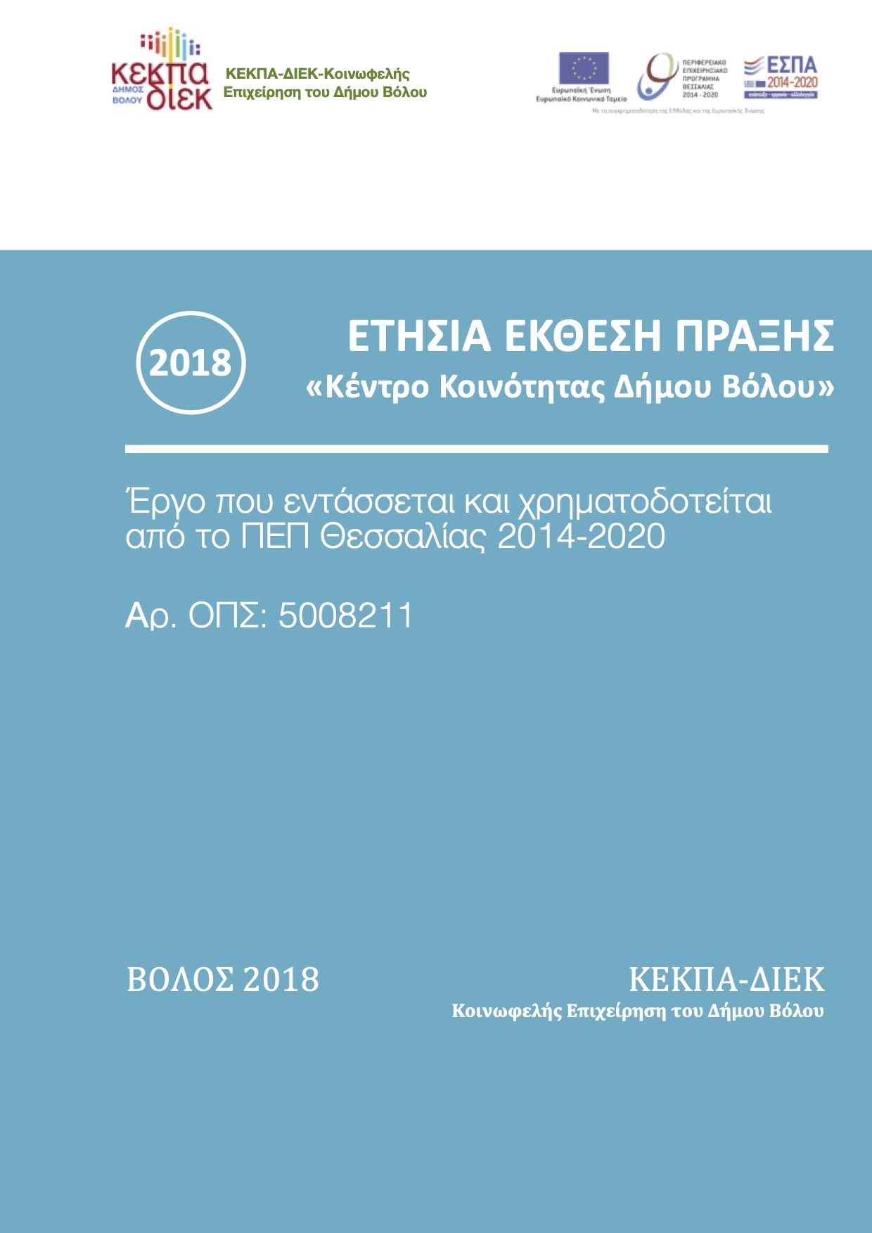 (2018) ΕΤΗΣΙΑ ΕΚΘΕΣΗ ΠΡΑΞΗΣ «Κέντρο Κοινότητας Δήμου Βόλου», ΟΠΣ 5002811