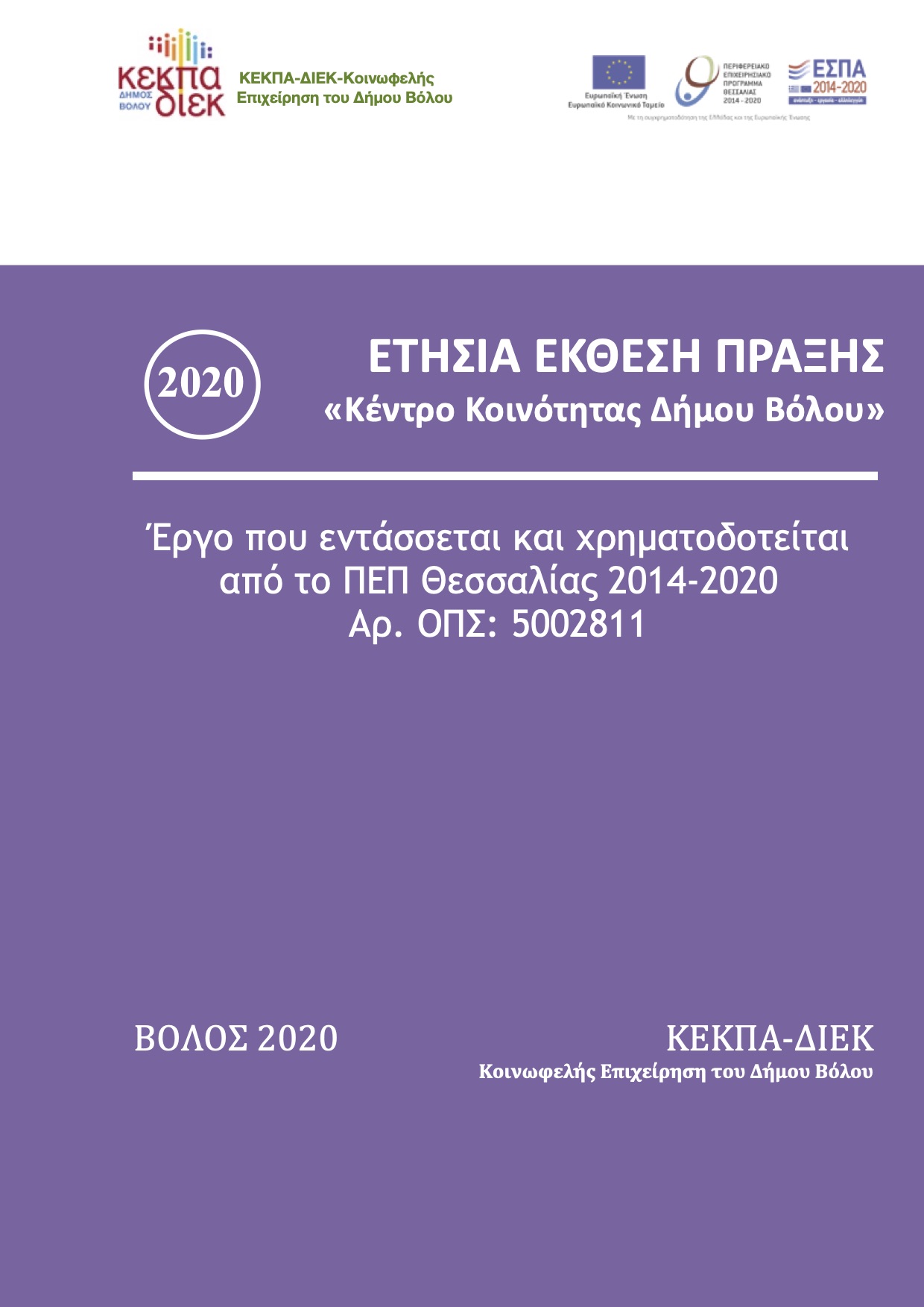 (2020) ΕΤΗΣΙΑ ΕΚΘΕΣΗ ΠΡΑΞΗΣ «Κέντρο Κοινότητας Δήμου Βόλου», ΟΠΣ 5002811