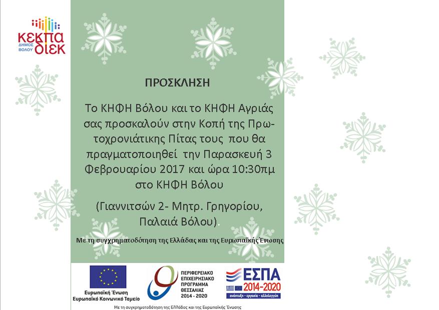 ΔΕΛΤΙΟ ΤΥΠΟΥ. -Τα Κέντρα Ημερήσιας Φροντίδας Ηλικιωμένων (ΚΗΦΗ) Βόλου και Αγριάς θα πραγματοποιήσουν την κοπή της Πρωτοχρονιάτικης Πίτας τους την Παρασκευή 3 Φεβρουαρίου και ώρα 10:30 πμ στο ΚΗΦΗ Βόλου (Γιαννιτσών 2- Μητρ. Γρηγορίου) στα Παλαιά.