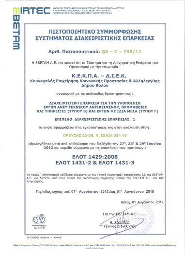 Η ΚΕΚΠΑ-ΔΙΕΚ πιστοποιήθηκε εκ νέου από την ΕΒΕΤΑΜ MIRTEC για την διαχειριστική επάρκειά της ως προς την υλοποίηση έργων με ίδια μέσα για την επόμενη τριετία (2015-2018). Αξίζει να σημειώσουμε ότι η ΚΕΚΠΑ-ΔΙΕΚ είναι πιστοποιημένη κατά το πρότυπο ΕΛΟΤ 1429:2008 από το 2012.