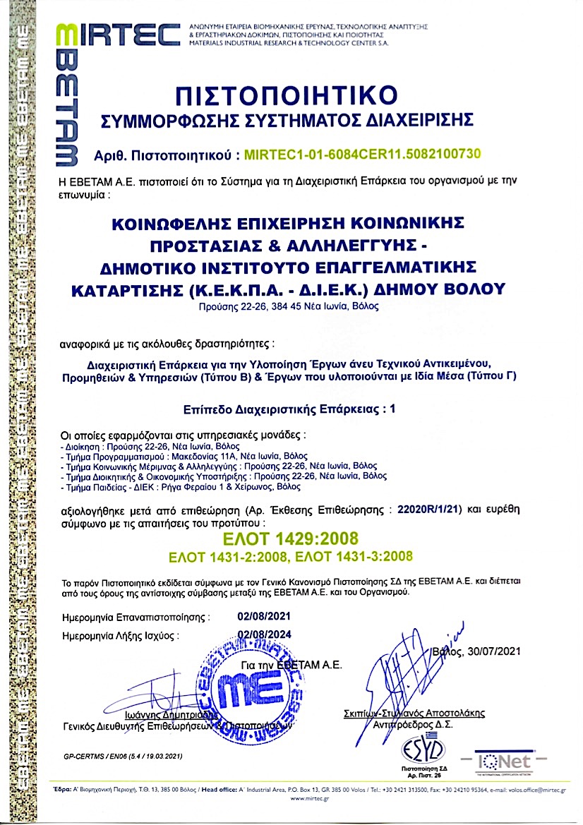 Τον Ιούλη του 2021, η ΚΕΚΠΑ-ΔΙΕΚ πέρασε με επιτυχία τη διαδικασία της 4ης επαναξιολόγησης του συστηματος διαχειριστικης επαρκειας της, συμφωνα με το πρότυπο ΕΛΟΤ 1429:2008. Το νεο ΠΙΣΤΟΠΟΙΗΤΙΚΟ ΣΥΜΜΟΡΦΩΣΗΣ έχει ισχύ για 3 έτη (2021-2024).