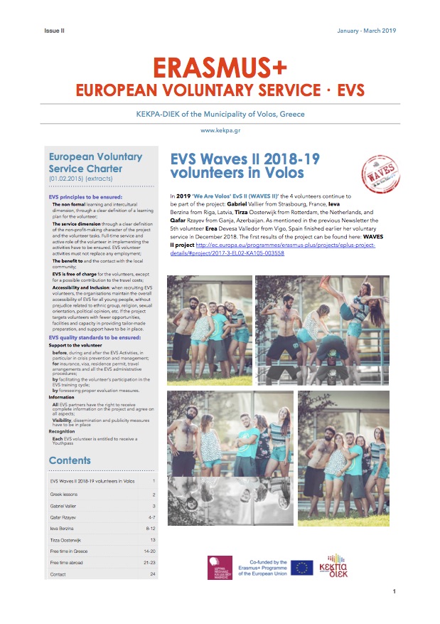 Οι 5 εθελοντές του έργου είναι οι εξής: (1) Erea Devesa Valledor από την Ισπανία, (2) Gabriel Vallier από τη Γαλλία, (3) Ieva Berzina από τη Λετονία, (4) Tirza Oosterwijk από τις Κάτω Χώρες, και (5) Qafar Rzayev από το Αζερμπαϊτζάν. Η φιλοξενία των 5 εθελοντών γίνεται σε ενοικιαζόμενο διαμέρισμα στο κέντρο της πόλης του Βόλου. Οι 5 εθελοντές απασχολούνται καθημερινά και εθελοντικά σε δομές της ΚΕΚΠΑ-ΔΙΕΚ της επιλογής τους (π.χ. ΠΑΙΔΙΚΟΙ ΣΤΑΘΜΟΙ, ΚΔΑΠ, ΚΔΑΠμεΑ, κλπ) συνεισφέροντας στην καθημερινή λειτουργία των δομών. Οι δαπάνες των εθελοντών είναι 100% καλυμμένες από τη χρηματοδότηση του προγράμματος ERASMUS+ 2014-2020 /ΤΟΜΕΑΣ ΝΕΟΛΑΙΑ. Στο πρόγραμμα απασχολείται και ένας Μέντορας για την καθημερινή υποστήριξη των εθελοντών στη μαθησιακή τους διαδικασία στην Ελλάδα.