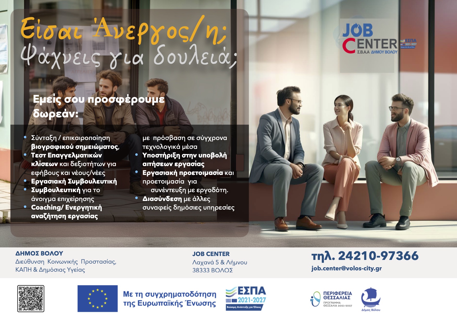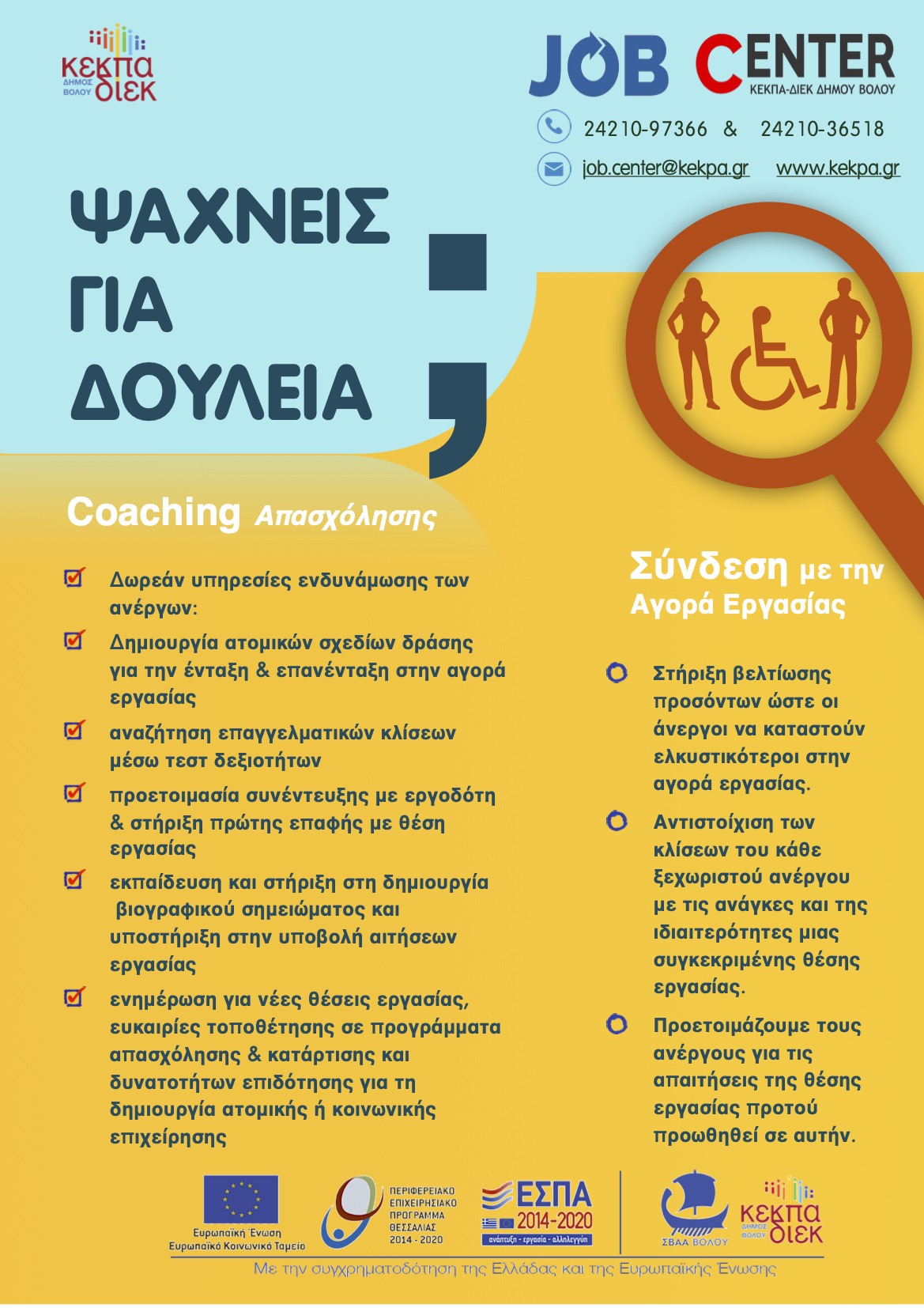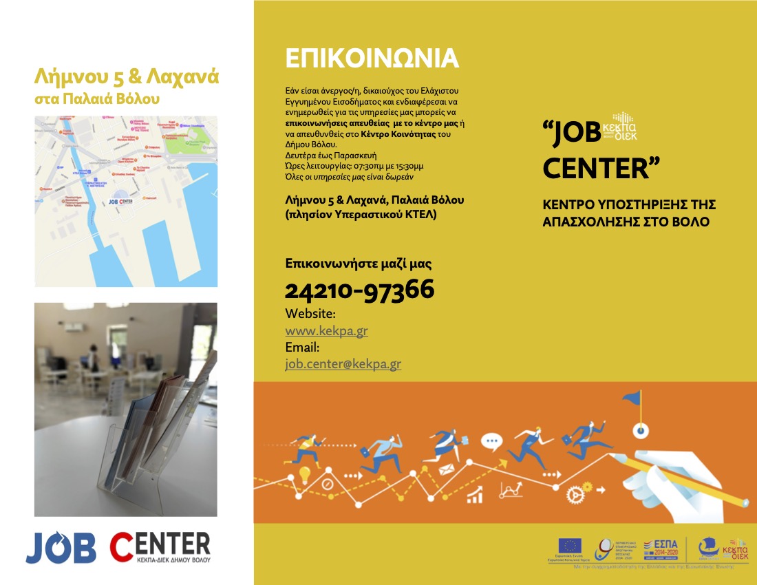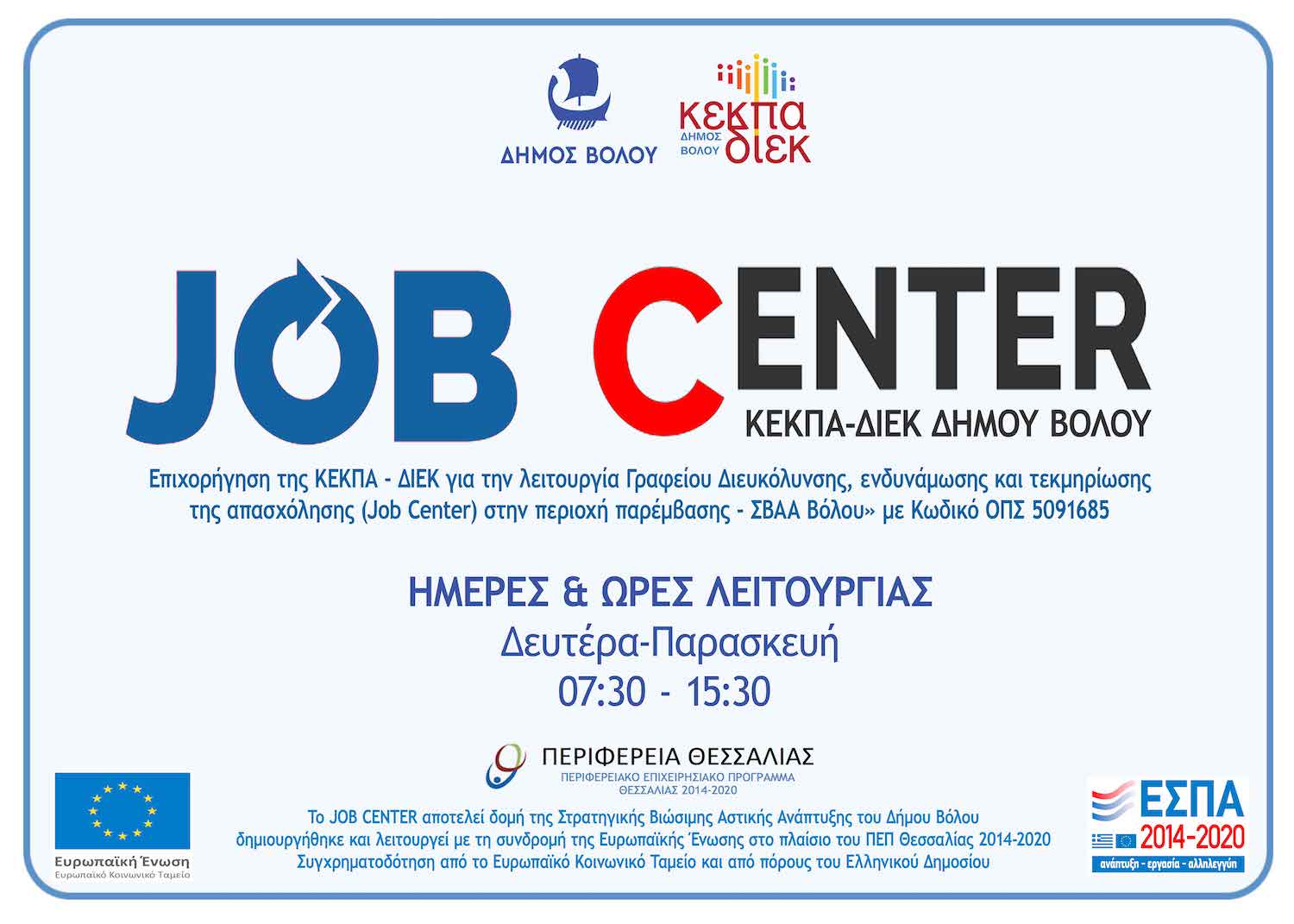 Συνέχιση λειτουργίας Γραφείου Διευκόλυνσης, ενδυνάμωσης και τεκμηρίωσης της απασχόλησης (Job Center) στην περιοχή παρέμβασης - ΣΒΑΑ Βόλου