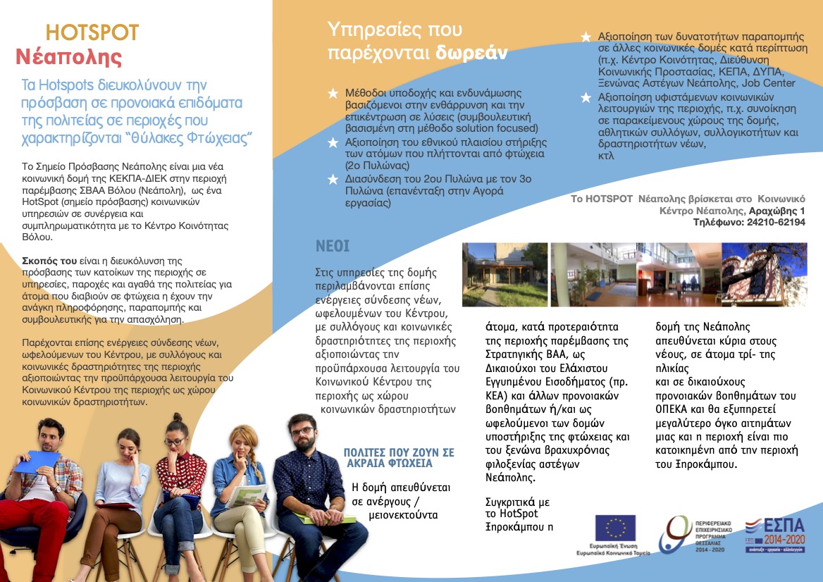 Η πράξη αφορά στη συνέχιση της χρηματοδότησης λειτουργίας της δομής κοινωνικού HotSpot Νεάπολης του Δήμου Βόλου για διάστημα 24 μηνών, ήτοι από 01/01/2024 έως 31/12/2025. Η πράξη περιλαμβάνεται στην εγκριθείσα Στρατηγική Βιώσιμης Αστικής Ανάπτυξης 2021-2027 (ΣΒΑΑ) του Δήμου Βόλου και αποτελεί σημείο υποδοχής ή και πρώτης επαφής των ωφελουμένων που διαβιούν σε συνθήκες φτώχειας, τους οποίους εξυπηρετεί ή/ και διασυνδέει με άλλες κοινωνικοπρονοιακές δομές της περιοχής