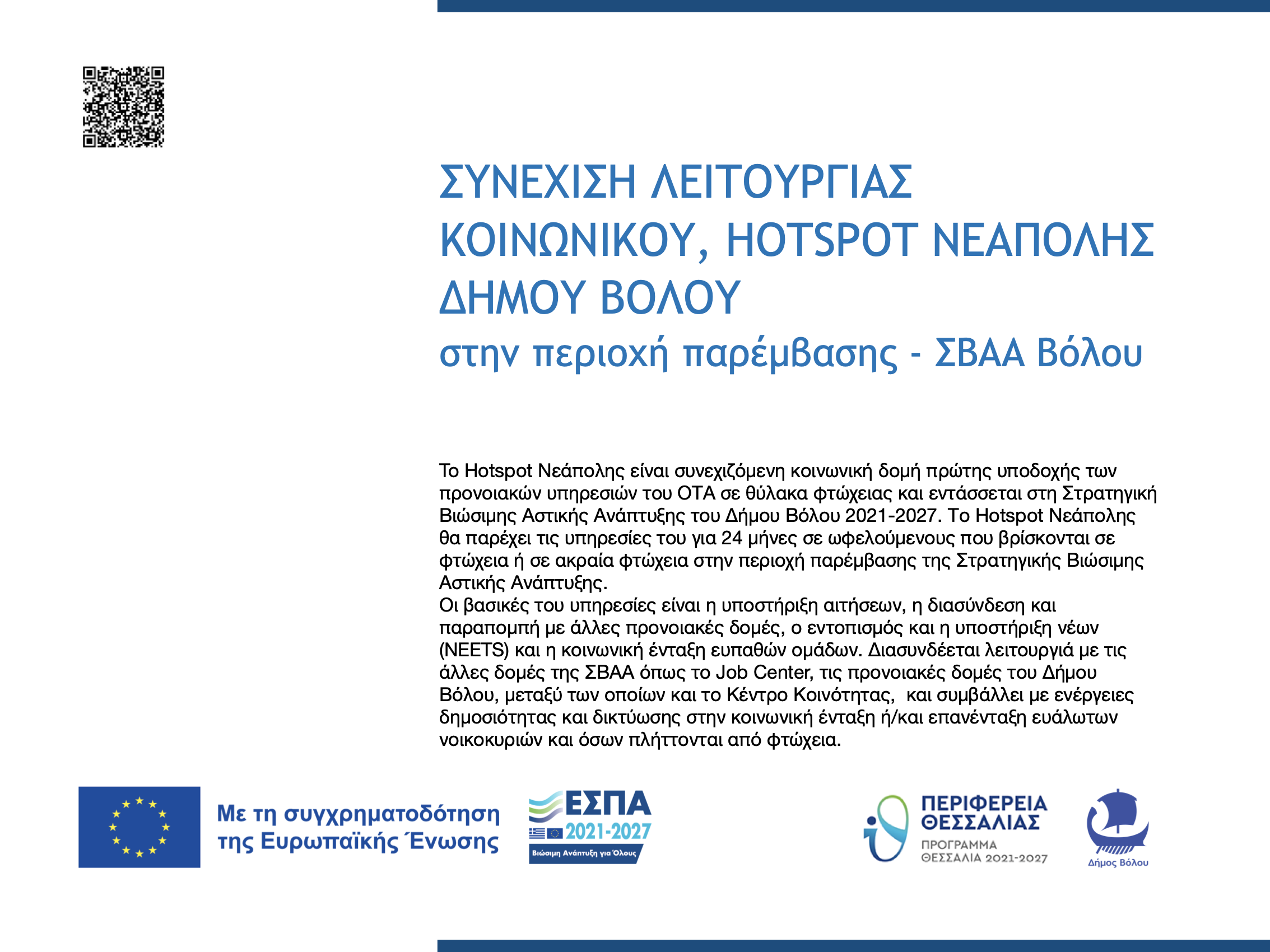 HOTSPOT Νεάπολης Συνέχιση Λειτουργίας Κοινωνικού Hotspot Νεάπολης Δήμου Βόλου «ΕΠΙΧΕΙΡΗΣΙΑΚΟΣ ΣΧΕΔΙΑΣΜΟΣ ΤΟΥ ΔΗΜΟΥ ΒΟΛΟΥ ΓΙΑ ΤΗΝ ΒΙΩΣΙΜΗ ΑΣΤΙΚΗ ΑΝΑΠΤΥΞΗ (ΒΑΑ)».