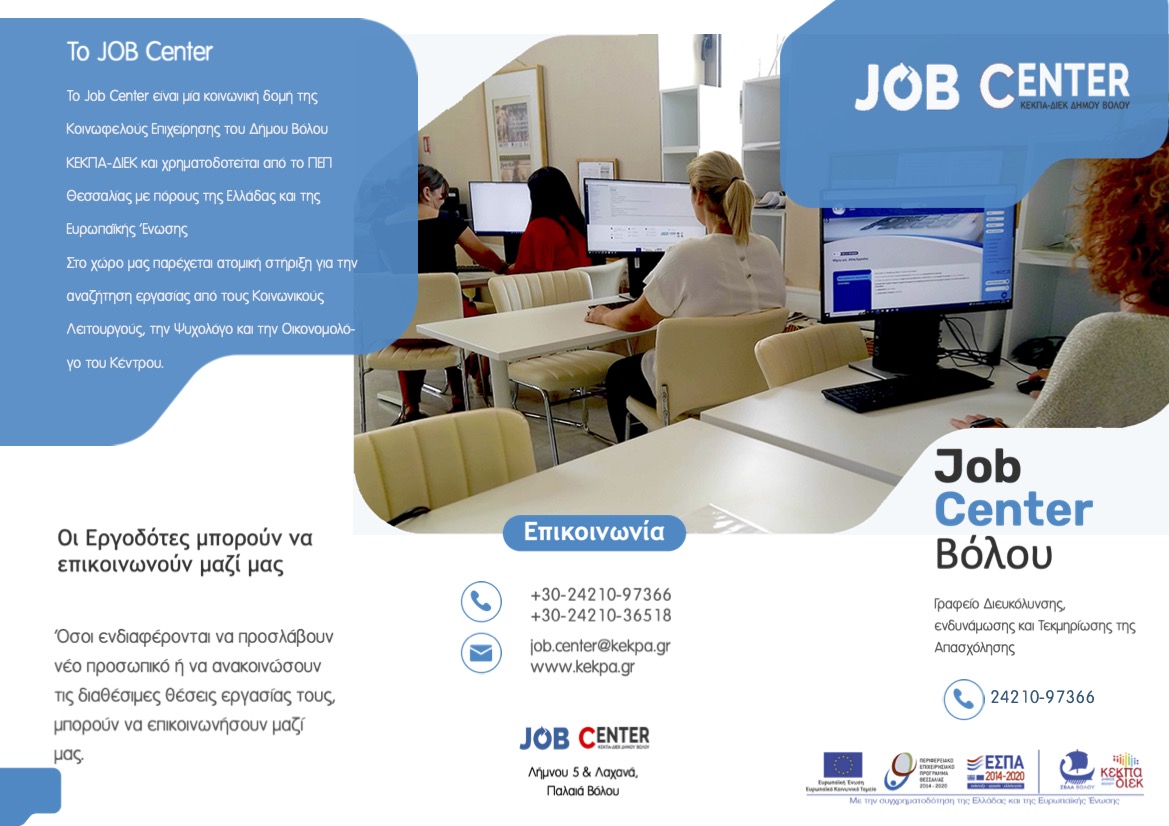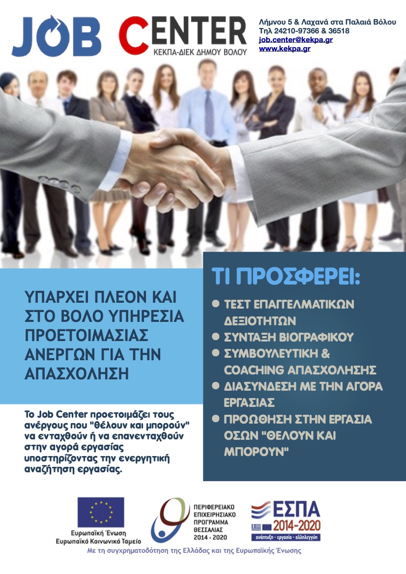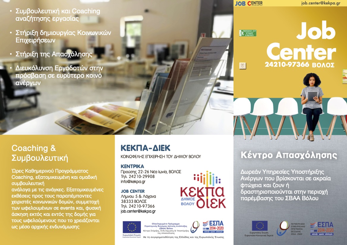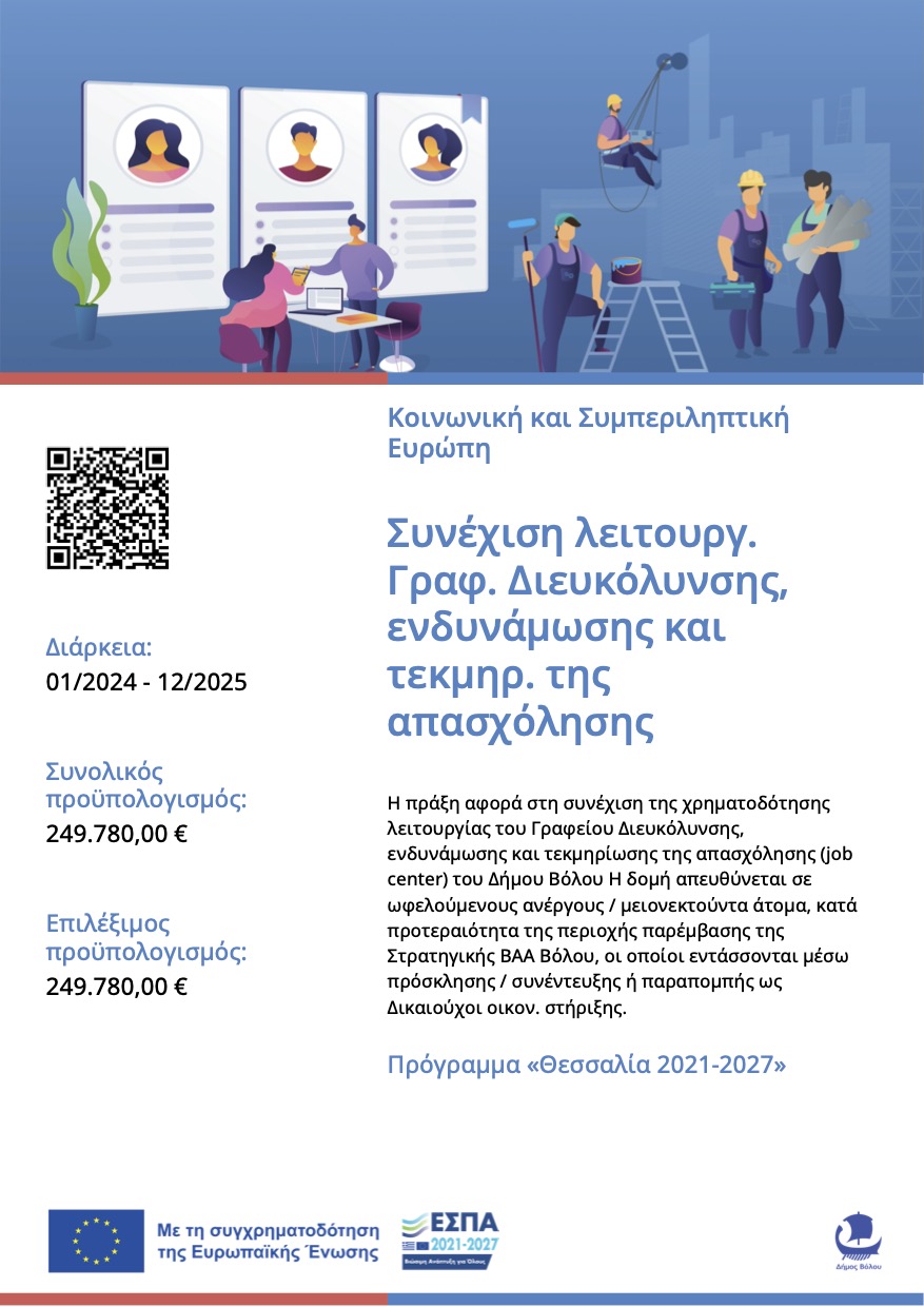 Συνέχιση λειτουργίας Γραφείου Διευκόλυνσης, ενδυνάμωσης και τεκμηρίωσης της απασχόλησης (Job Center) στην περιοχή παρέμβασης - ΣΒΑΑ Βόλου