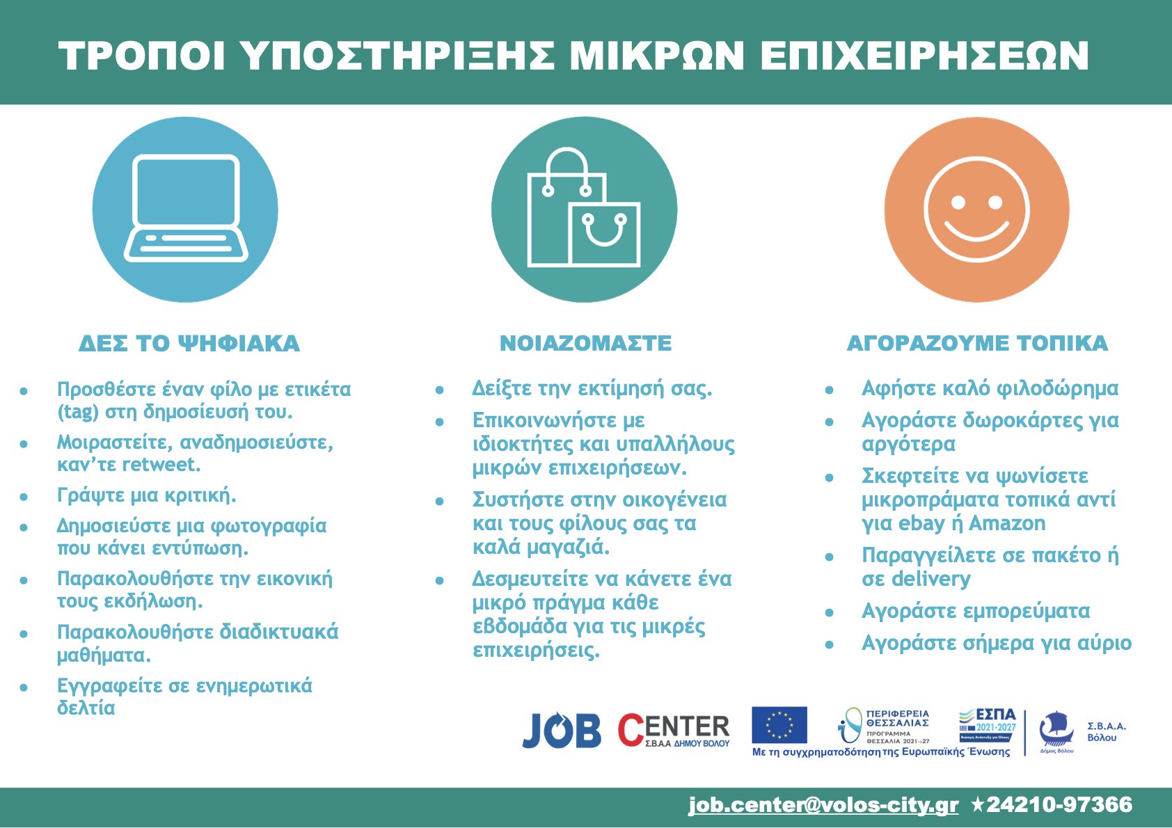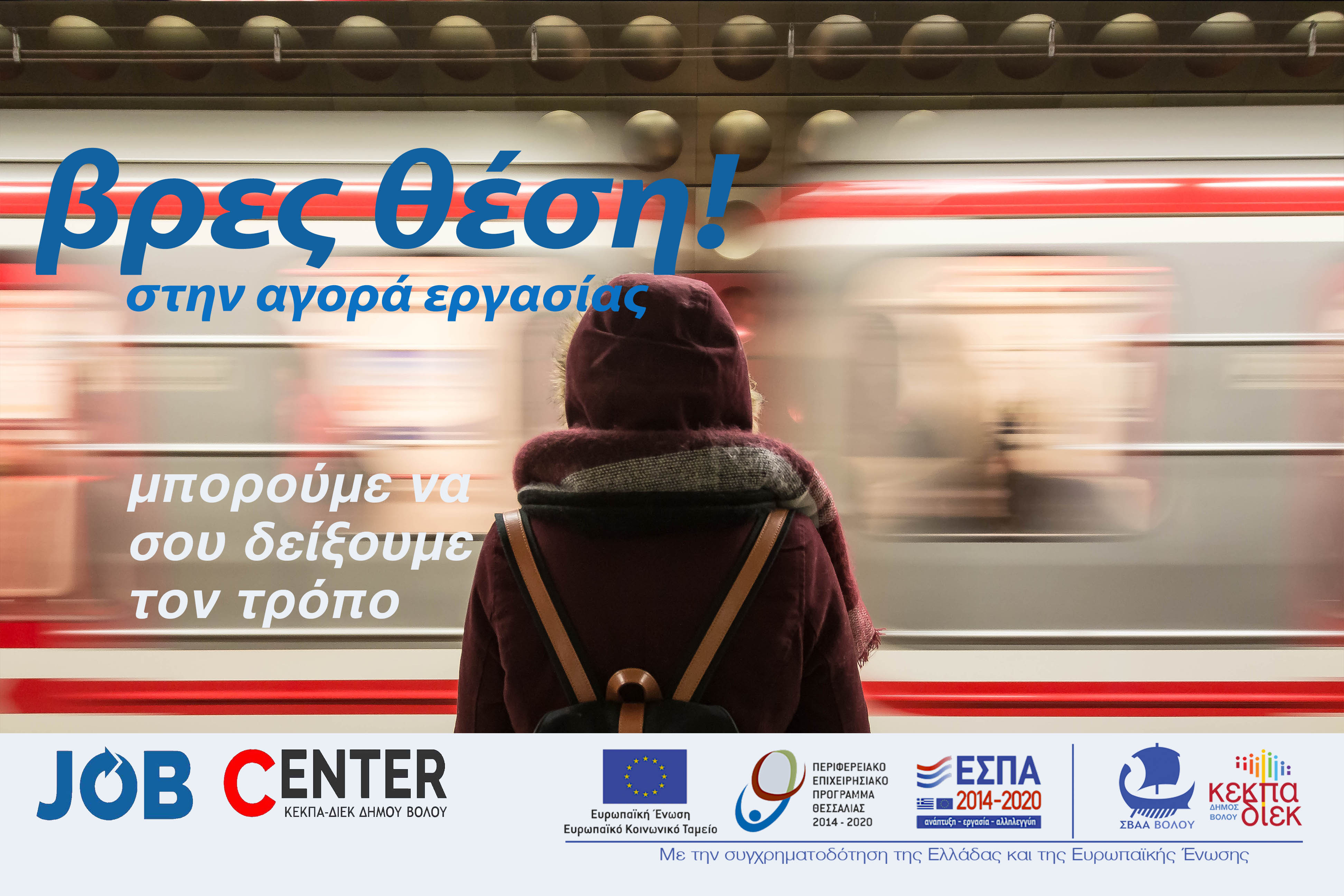 Το Γραφείο Διευκόλυνσης, ενδυνάμωσης και τεκμηρίωσης της απασχόλησης (Job Center) στην περιοχή παρέμβασης - ΣΒΑΑ Βόλου» με κωδικό ΟΠΣ (MIS) 6005092, είναι συνεχιζόμενη δομή προιώθησης της απασχόλησης στα πλαίσια εφαρμογής της Στρατηγικής Βιώσιμης Αστικής Ανάπτυξης (ΣΒΑΑ) Βόλου και χρηματοδοτείται από την Ελλάδα και την Ευρωπαϊκή Ένωση μέσω του προγράμματος "Θεσσαλία 2021-'27".