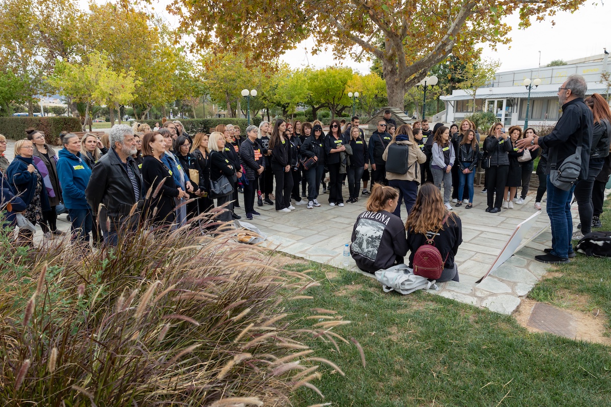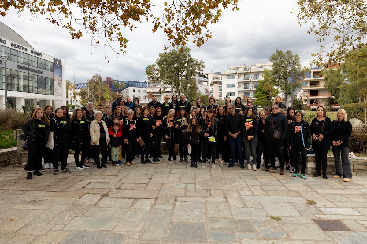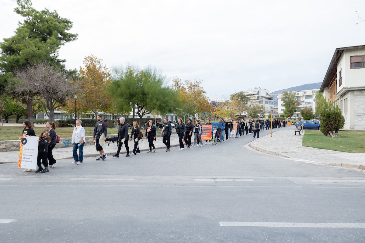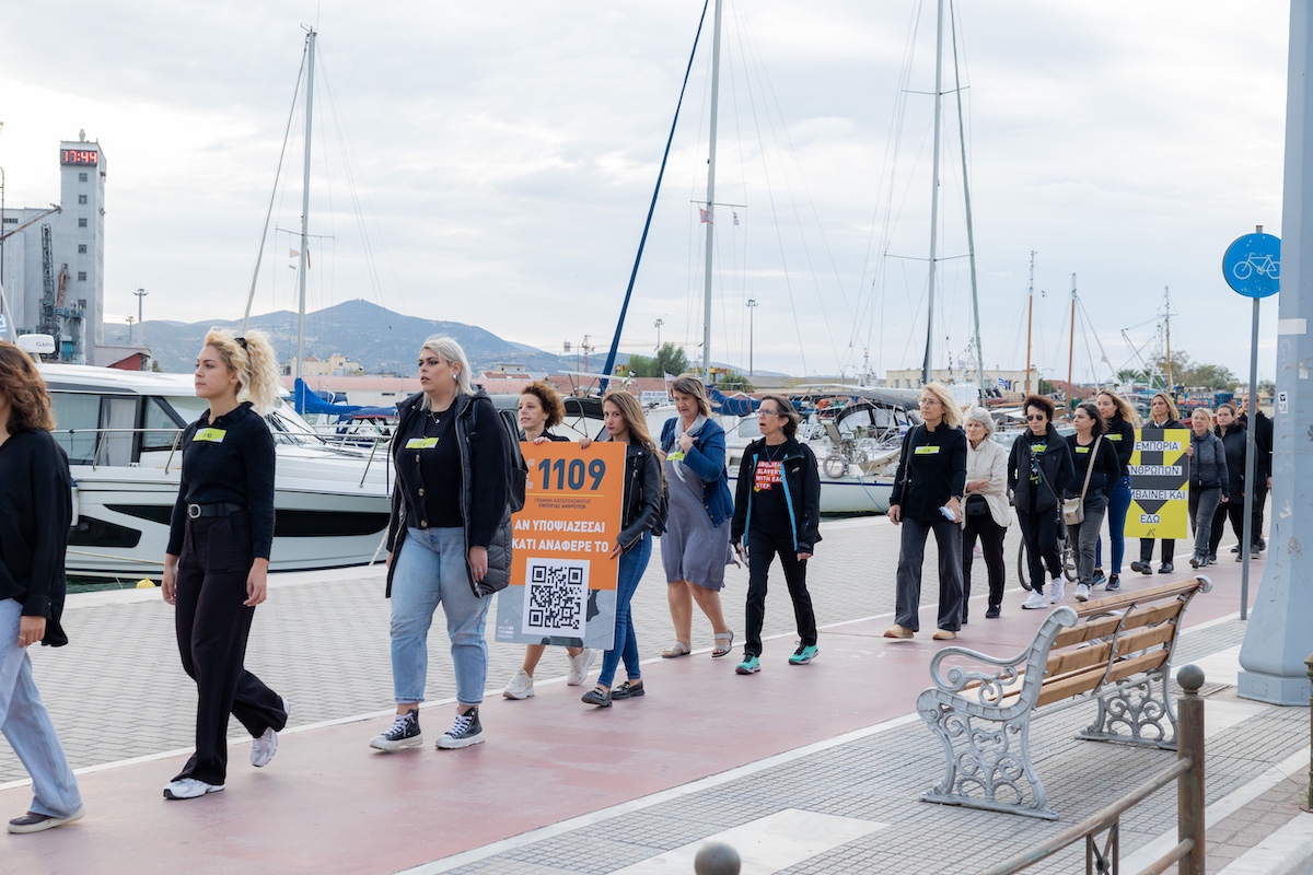 Στη συνέχεια, δημιουργήθηκαν ανθρώπινες αλυσίδες με τη συμμετοχή 107 συμπολιτών και συμπολιτισσών μας που διέσχισαν την παραλιακή οδό καταλήγοντας λιγο μετά το άγαλμα της ελευθερίας (Μνημείο ΗΡΩΩΝ) στην έδρα του Πανεπιστημίου Θεσσαλίας, όπου μοιράστηκε ενημερωτικό υλικό. Ειδικότερα, δόθηκε έμφαση στην 24ωρη Γραμμή Πληροφόρησης και Καταγγελιών 1109 της ΜΚΟ Α21, που δίνει τη δυνατότητα ανώνυμης καταγγελίας και τηλεδιερμηνείας σε 200 γλώσσες.