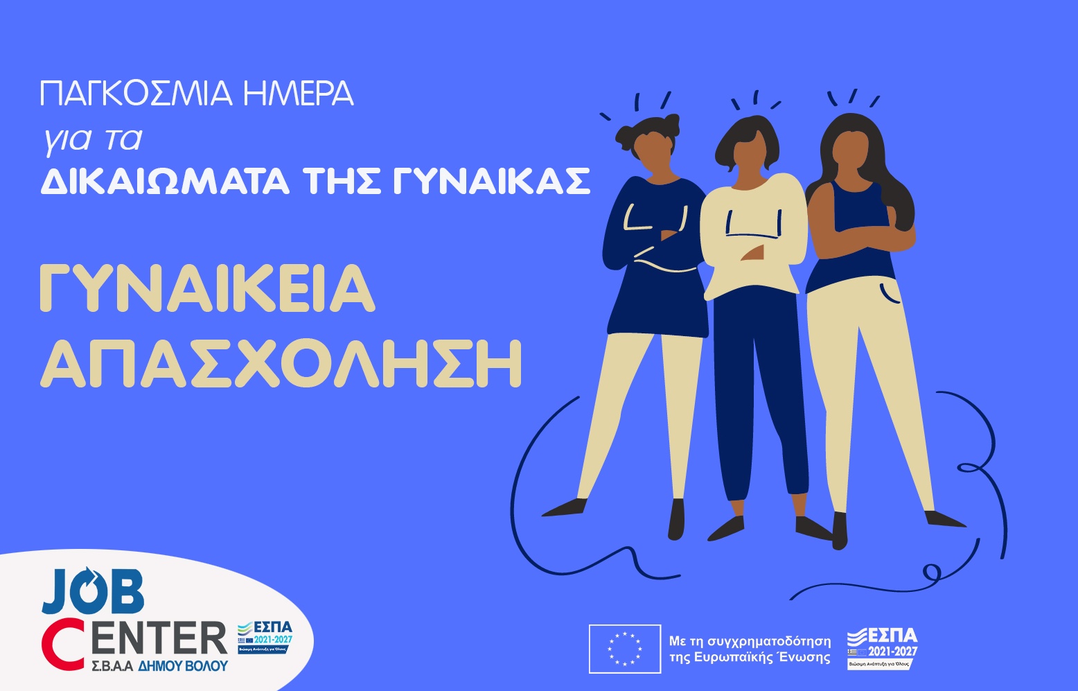 Με αφορμή τη Διεθνή Ημέρα Δικαιωμάτων της Γυναίκας που θεσπίστηκε το 1977 και εορτάζεται κάθε 8η Μαρτίου, η διεπιστημονική ομάδα του Γραφείου Διευκόλυνσης, Ενδυνάμωσης και Τεκμηρίωσης της Απασχόλησης "Job Center" Δήμου Βόλου επιθυμεί να επισημάνει το αναφαίρετο δικαίωμα κατά το άρθρο 15* στην αμειβόμενη εργασία (*Χάρτης θεμελιωδών δικαιωμάτων της Ε.Ε.). Άλλωστε, η τεκμηριωμένη, ασφαλής και μη αφανής εργασία είναι άρρηκτα συνδεδεμένη με την βασική φιλοσοφία του Job Center που υποστηρίζει την ενεργό ένταξη στην παραγωγική διαδικασία και κατ' επέκταση προάγει την εργασιακή ικανοποίηση.