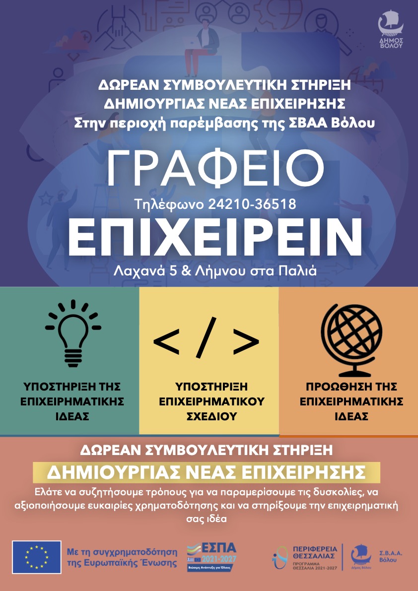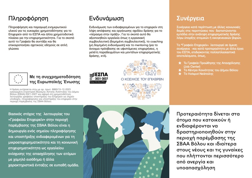 | Το Γραφείο Επιχειρείν είναι μια δομή πληροφόρησης για τις ευκαιρίες για το Επιχειρείν και της ενδυνάμωσης των ωφελουμένων στην απόφασή τους για την ανάληψη επιχειρηματικής δράσης σε ατομικό ή συνεταιριστικό επίπεδο. Απευθύνεται κυρίως στους κατοίκους και όσους ενδιαφέρονται να δραστηριοποιηθούν στην περιοχή παρέμβασης ΣΒΑΑ Βόλου (2021-27), με έμφαση στα άτομα που προέρχονται από ευπαθείς ομάδες και ιδιαίτερα τις γυναίκες και τους νέους που πλήττονται περισσότερο από το μέσο όρο από φτώχεια, ανεργία και υποαπασχόληση. Η δομή λειτουργεί σε συνέργεια με το Job Center και άλλες κοινωνικές δομές (όπως το Κέντρο Κοινότητας) και θα απασχολήσει συνολικά 4 άτομα διαφόρων ειδικοτήτων. |