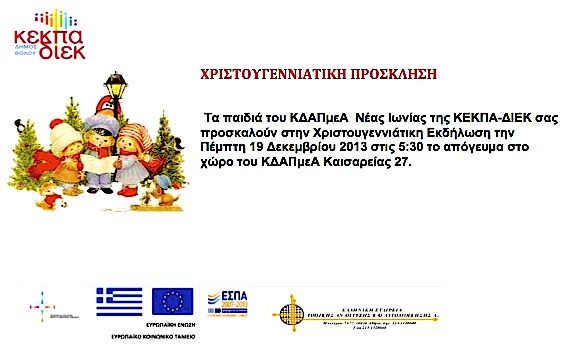 Τα παιδιά του ΚΔΑΠμεΑ Νέας Ιωνίας της ΚΕΚΠΑ-ΔΙΕΚ σας προσκαλούν στην Χριστουγεννιάτικη Εκδήλωση την Πέμπτη 19 Δεκεμβρίου 2013 στις 5:30 το απόγευμα στο χώρο του ΚΔΑΠμεΑ Καισαρείας 27.