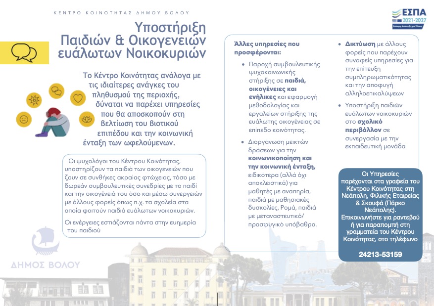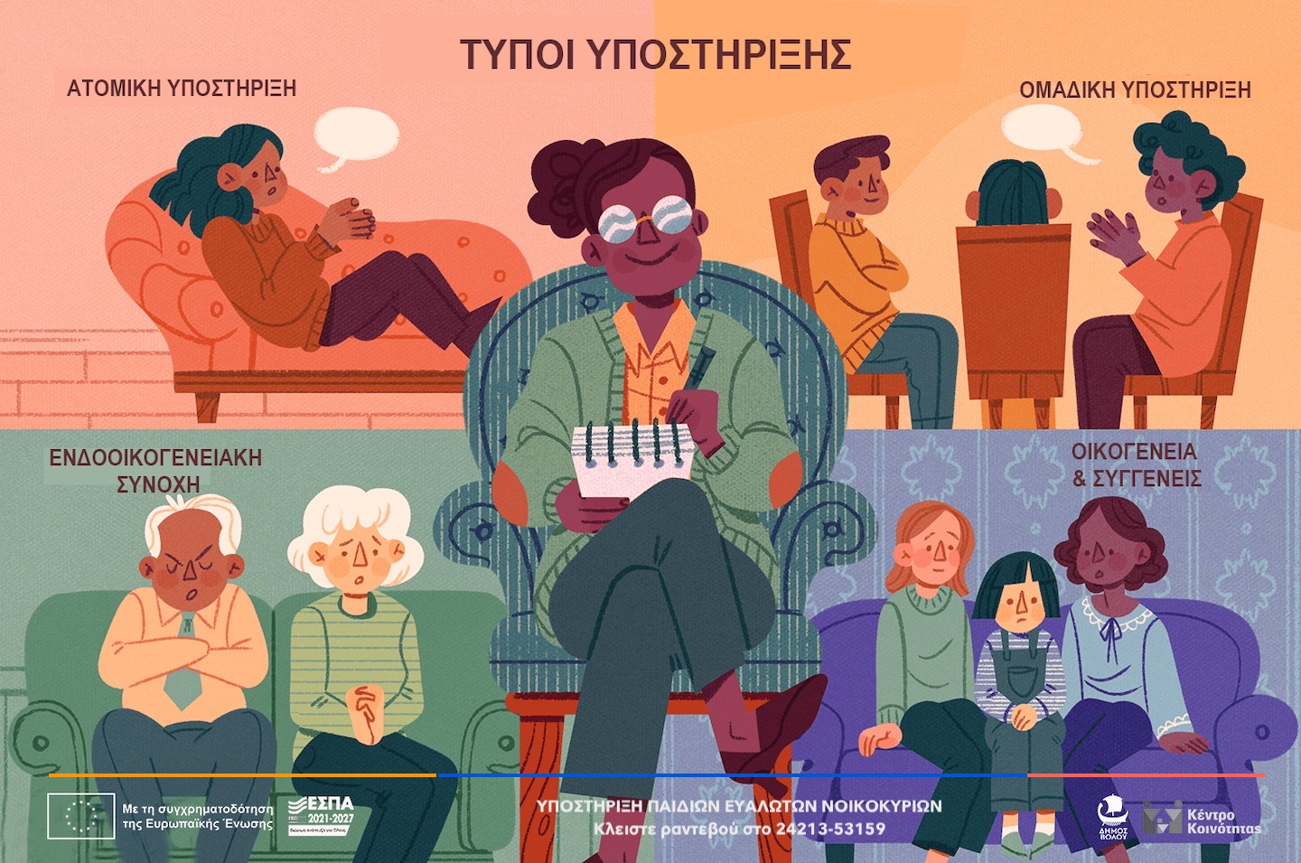 - Παραπομπή σε υπηρεσίες συμβουλευτικής ψυχοκοινωνικής στήριξης για άτομα και οικογένειες,
