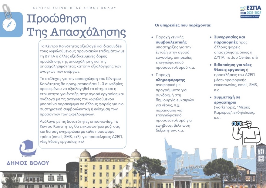 ΥΠΟΒΟΛΗ ΑΙΤΗΣΕΩΝ ΕΠΙΔΟΜΑΤΩΝ ΟΠΕΚΑ -ΠΡΟΩΘΗΣΗ ΤΗΣ ΑΠΑΣΧΟΛΗΣΗΣ -ΠΑΡΑΠΟΜΠΗ ΣΕ ΚΟΙΝΩΝΙΚΕΣ ΥΠΗΡΕΣΙΕΣ & ΥΠΗΡΕΣΙΕΣ ΥΓΕΙΑΣ -ΣΥΜΒΟΥΛΕΥΤΙΚΗ & ΠΛΗΡΟΦΟΡΗΣΗ