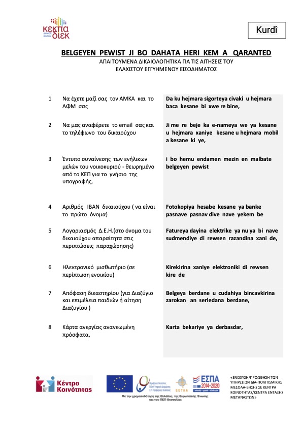 Απαιτούμενα δικαιολογητικά ΕΕΕ και Στέγασης στην Κουρδική (Κουρμαντζί) γλώσσα