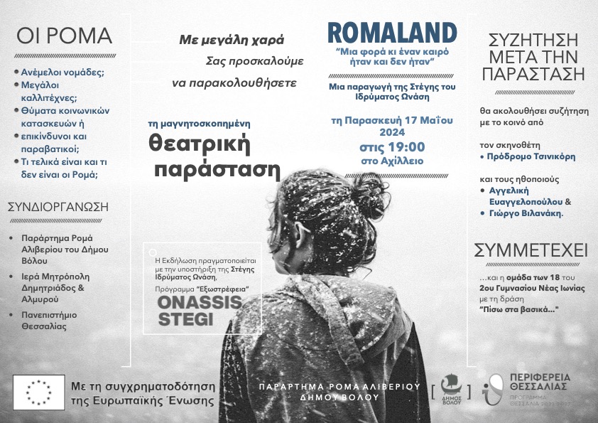 Το Παράρτημα Ρομά Αλιβερίου του τμήματος Κοινωνικής Προστασίας του δήμου Βόλου σε συνεργασία με την Ιερά Μητρόπολη Δημητριάδος & Αλμυρού και το Πανεπιστήμιο Θεσσαλίας φιλοδοξούν να απαντήσουν στα παραπάνω ερωτήματα προβάλλοντας μαγνητοσκοπημένη τη θεατρική παράσταση «Romáland – Mια φορά κι έναν καιρό ήταν και δεν ήταν» των Ανέστη Αζά και Πρόδρομου Τσινικόρη.