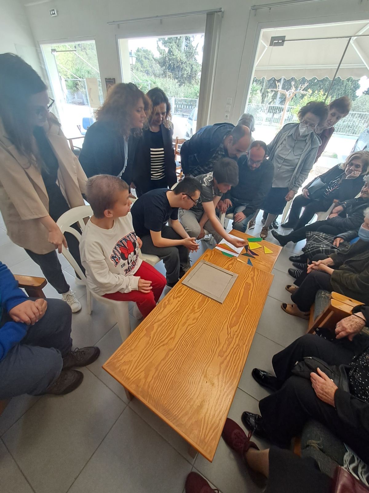 Κατά την άφιξη των μαθητών/τριων στο Κ.Η.Φ.Η. Νέας Αγχιάλου οι εργαζόμενες της δομής, οι ηλικιωμένοι ωφελούμενοι, η Υπεύθυνη κ. Μαρία Ζαβού, όπως κι η Αντιδήμαρχος Παιδείας και Εκπαίδευσης του Δήμου Βόλου κ. Γεωργία Μποντού Τοκαλή, υποδέχθηκαν και καλωσόρισαν τους μαθητές /τριες του Ε.Ε.Ε.ΕΚ. Αλμυρού και τους /τις συνοδούς εκπαιδευτικούς. Ακολούθησε η γνωριμία των ηλικιωμένων με τα παιδιά, έπειτα οι μαθητές/τριες απηύθυναν ερωτήσεις στους/στις ηλικιωμένους / νες σχετικά με την παιδική τους ηλικία, τις εμπειρίες τους και τους/τις ζήτησαν να τους αφηγηθούν τις αναμνήσεις τους από τη σχολική τους ζωή. Οι ηλικιωμένοι/νες με χαρά και νοσταλγία μίλησαν στα παιδιά για τα παιχνίδια της νιότης τους κι όλοι μαζί έπαιξαν με ένα από τα αρχαιότερα παζλ, ένα αντίγραφο του παιχνιδιού «Οστομάχιον» του Αρχιμήδη, το οποίο κατασκεύασαν οι μαθητές /τριες του Ε.Ε.Ε.ΕΚ. Αλμυρού με τη βοήθεια του μαθηματικού του σχολείου κ. Φίλιππου Στεργιανού.