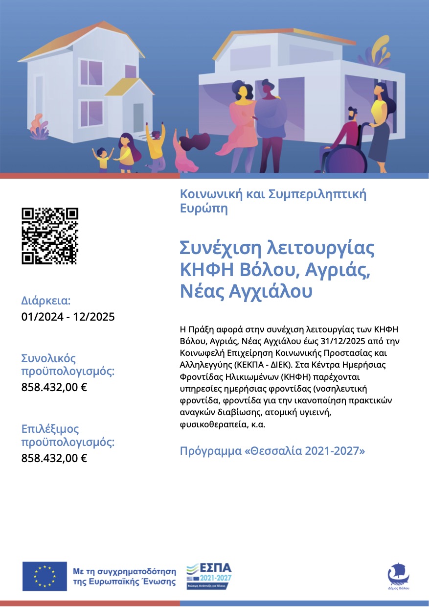 Συνέχιση λειτουργίας ΚΗΦΗ Βόλου, Αγριάς, Νέας Αγχιάλουκωδ. ΟΠΣ 6003251 πρόγραμμα "Θεσσαλία 2021-'27" |