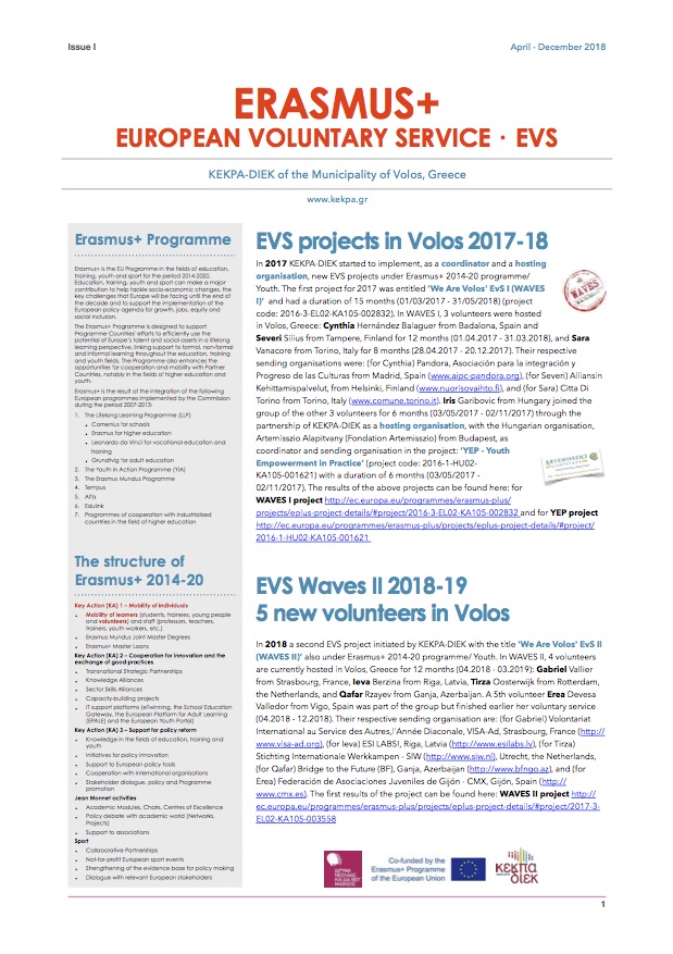 Το προηγούμενο έργο υποδοχής 5 εθελοντών της ΚΕΚΠΑ-ΔΙΕΚ με τιτλο: WAVES II: We Are Volos' EvS II και κωδικό 2017-3-EL02-KA105-003558, που ολοκληρωθηκε πέρυσι το καλοκαίρι στις 30/06/2019 εμφανίζεται στη βάση δεδομένων των αποτελεσμάτων των έργων του Erasmus+ 2014-20 (Erasmus+ Project Results) ως "Παράδειγμα Καλής Πρακτικής" (Good Practice Example).