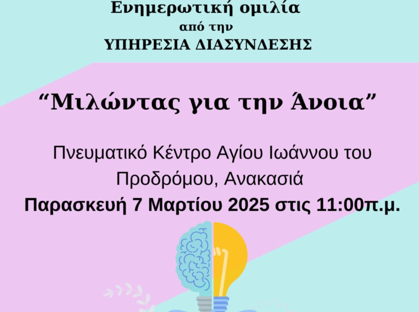 Η Ελληνική Εταιρία Νόσου Alzheimer & Συγγενών Διαταραχών (Υπηρεσία Διασύνδεσης) Βόλου,η Αντιδημαρχία Κοινωνικής Μέριμνας -Αλληλεγγύης -Ισότητας και Διαχείρισης Κοινωνικών Κέντρων και η δομή "Βοήθεια στο Σπίτι" Ιωλκού συνδιοργανώνουν ενημερωτική ομιλία με θέμα "Μιλώντας για την Άνοια" στο Πνευματικό Κέντρο Αγ.Ιωάννου του Προδρόμου στη Ανακασιά Ιωλκού την Παρασκευή 7 Μαρτίου 2025 στις 11:00