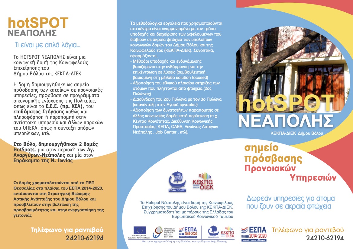 Η πράξη αφορά στη συνέχιση της χρηματοδότησης λειτουργίας της δομής κοινωνικού HotSpot Νεάπολης του Δήμου Βόλου για διάστημα 24 μηνών, ήτοι από 01/01/2024 έως 31/12/2025. Η πράξη περιλαμβάνεται στην εγκριθείσα Στρατηγική Βιώσιμης Αστικής Ανάπτυξης 2021-2027 (ΣΒΑΑ) του Δήμου Βόλου και αποτελεί σημείο υποδοχής ή και πρώτης επαφής των ωφελουμένων που διαβιούν σε συνθήκες φτώχειας, τους οποίους εξυπηρετεί ή/ και διασυνδέει με άλλες κοινωνικοπρονοιακές δομές της περιοχής